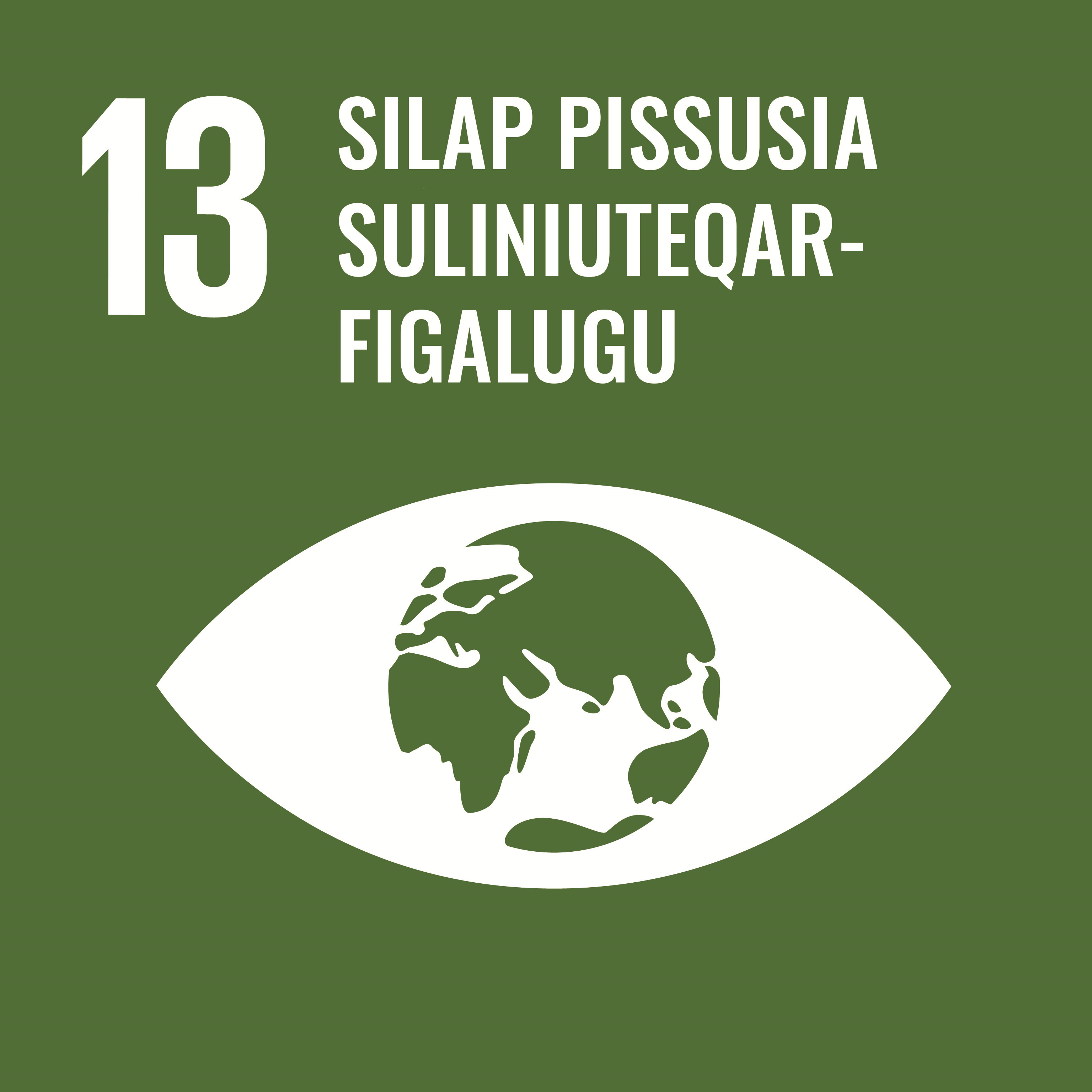 Nunarsuarmioqatigiit anguniagaat nr. 13 – Sila pillugu suliniutit Anguniarneqartoq tassaavoq ukiut suliffissuaqarfiit sioqqullugit nunarsuarmi agguaqatigiissillugu silap kissassusia gradinik marlunnik qaffatsaaliorneqarnissaa, nunarsuullu immikkoortuni inuup piliaanik sunnertiasuni akiuussuseqarsinnaassutsip silallu pissusaanut naleqqussarsinnaassutsip nukittorsarnissaa. |